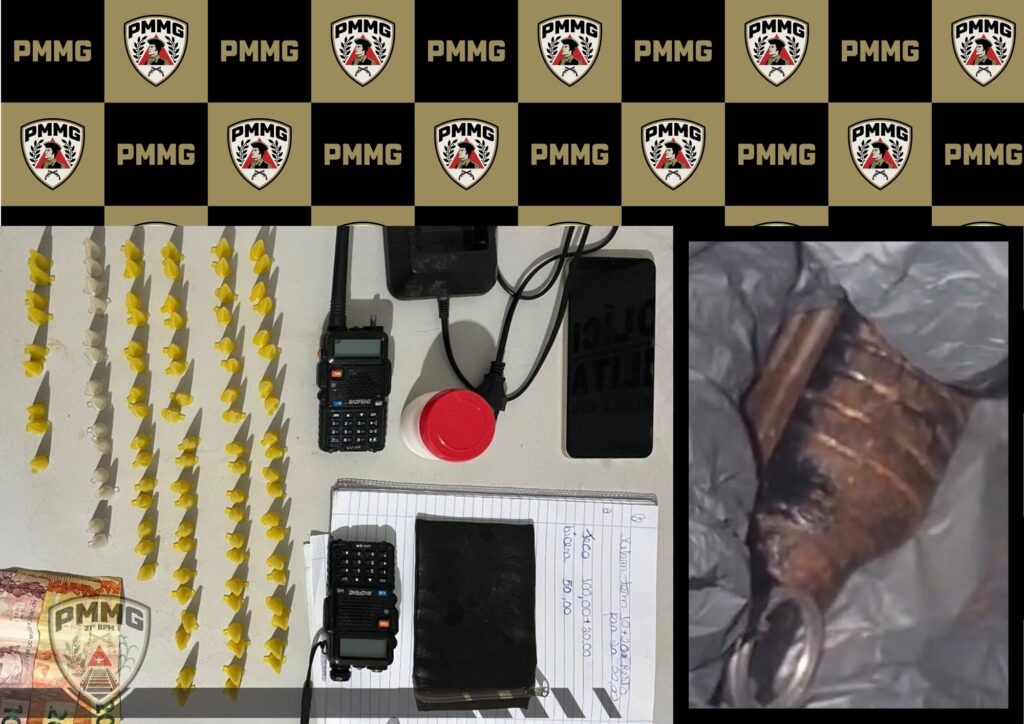 Durante as buscas no imóvel, foram localizados entorpecentes, além de materiais comumente utilizados no tráfico de drogas. Em um dos quartos da residência, pertencente a um homem falecido recentemente, apontado por testemunhas como liderança do tráfico local, foi encontrado um artefato explosivo do tipo granada, além de rádios comunicadores.