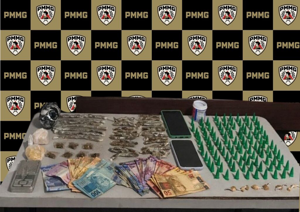 No interior da pochete foram localizados 105 pinos de substância análoga à cocaína, 27 buchas de substância análoga à maconha, 07 buchas de substância análoga à skank, 10 pedras e duas porções maiores de substância análoga ao crack, uma balança de precisão e certa quantia em dinheiro.