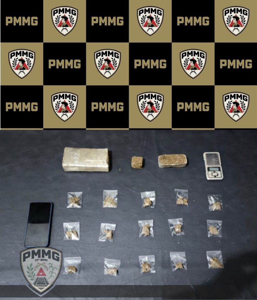 Durante o policiamento de Carnaval 2026, a Polícia Militar prendeu um homem por tráfico ilícito de drogas na Rua Avelino Jacinto Coimbra, bairro Alvorada, em Tabuleiro/MG.