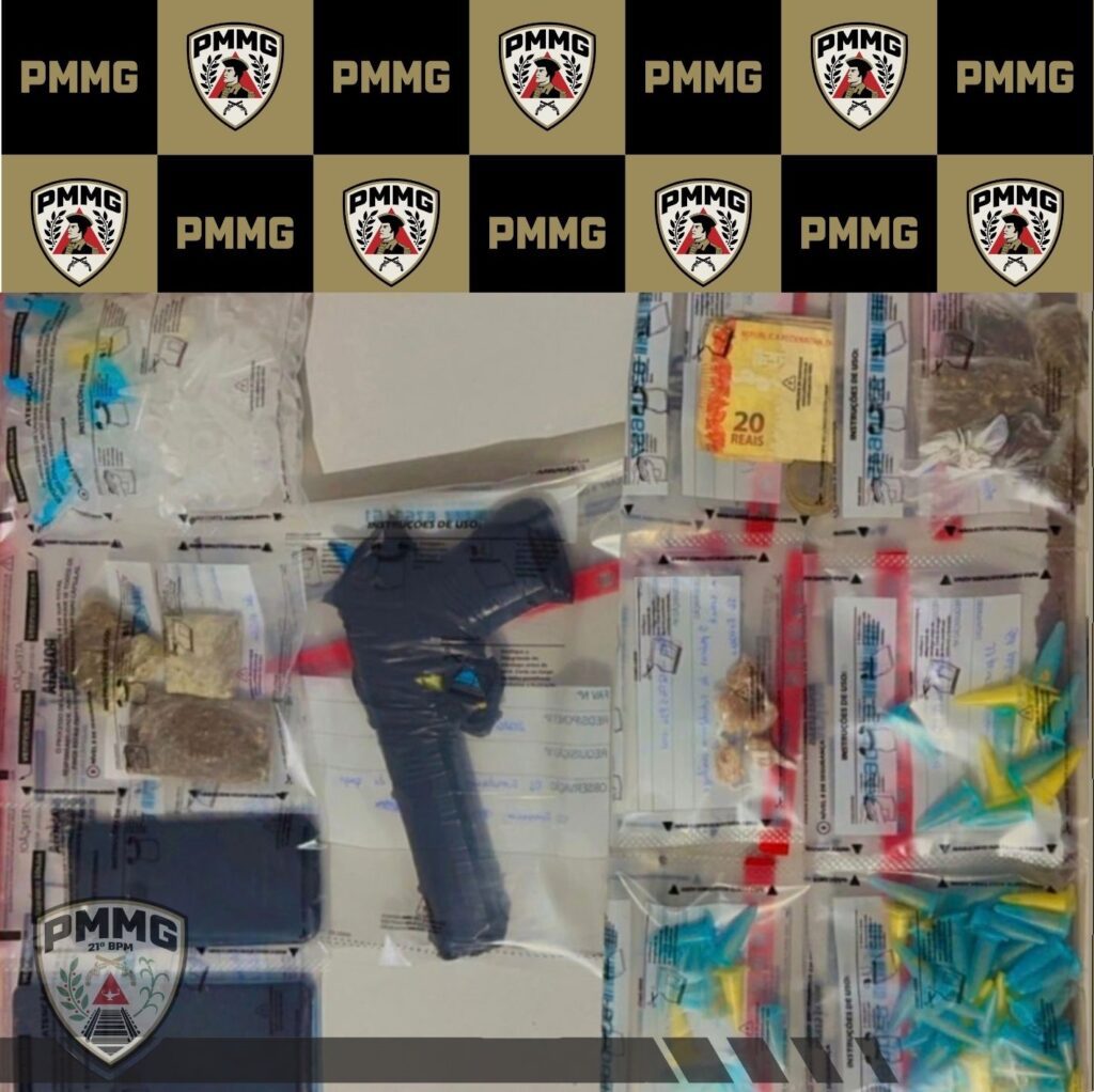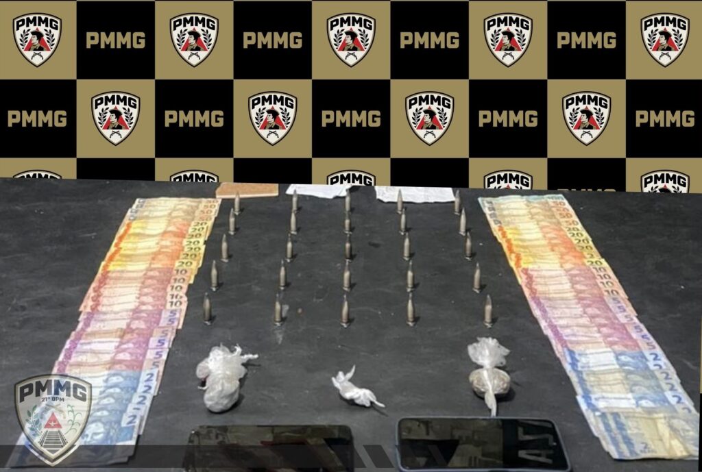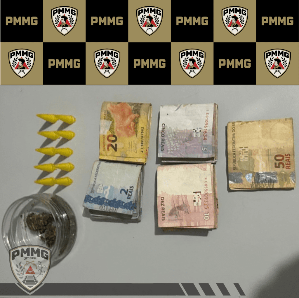 Na sequência das diligências, os militares localizaram 10 pinos contendo substância semelhante à cocaína, uma porção de substância análoga à maconha e certa quantia em dinheiro, materiais que indicam a prática de comércio ilícito de entorpecentes.