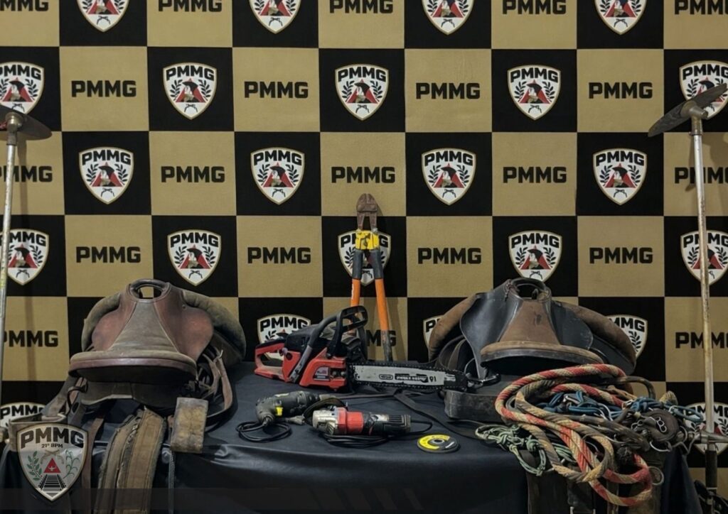 Durante a verificação no imóvel, os militares localizaram diversos materiais suspeitos em um corredor da residência, entre eles selas de couro, roçadeiras, motosserra, furadeira, lixadeira, rédeas e outros equipamentos, além de um alicate possivelmente utilizado para arrombamento de cadeado. Também foram encontradas peças de carne bovina armazenadas em um freezer, sem embalagem adequada.