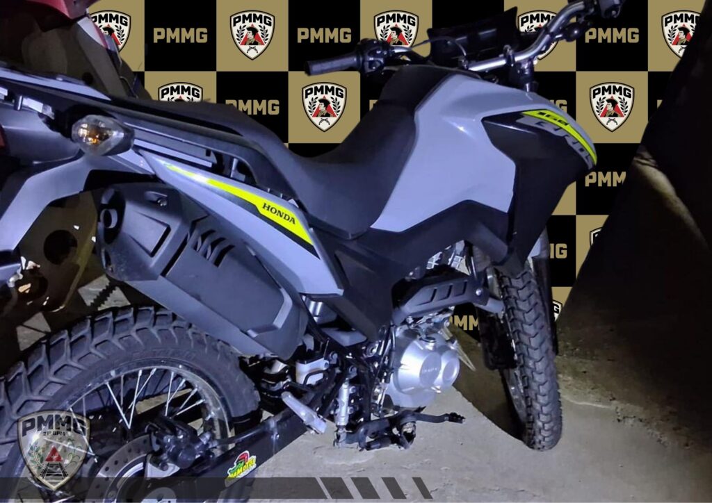 A motocicleta abordada, um Honda NXR 160 de cor cinza, apresentava indícios de irregularidade, sendo posteriormente constatada situação de adulteração/clonagem de sinais identificadores, o que reforçou a fundada suspeita e a necessidade de intervenção policial.