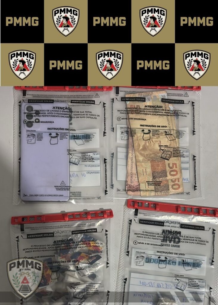 Em busca pessoal, foram encontrados com o indivíduo de 19 anos certa quantia em dinheiro, em notas fracionadas, além de um aparelho celular, possivelmente utilizado na atividade ilícita.
