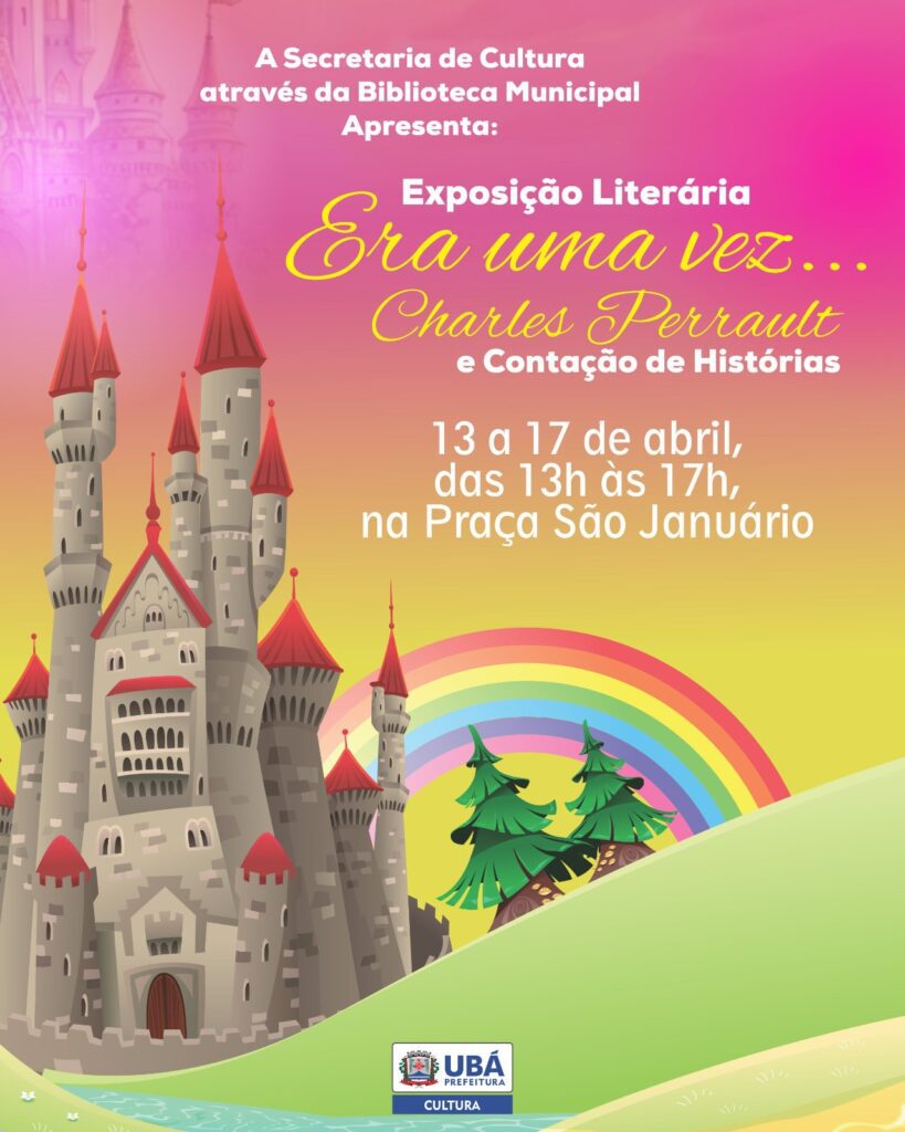 A Prefeitura de Ubá, por meio da Secretaria Municipal de Cultura e da Biblioteca Municipal, realiza entre os dias 13 e 17 de abril, na Praça São Januário, a exposição literária “Era uma vez… Charles Perrault”, acompanhada de atividades de contação de histórias. O evento acontecerá das 13h às 17h e promete encantar públicos de todas as idades.