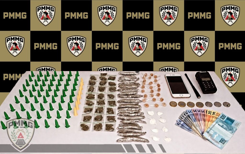 Na abordagem, foram localizados com o suspeito um aparelho celular, um rádio comunicador e certa quantia em dinheiro. Na sacola dispensada, os policiais encontraram diversas porções de substâncias semelhantes à maconha, cocaína e crack, já fracionadas e prontas para comercialização.