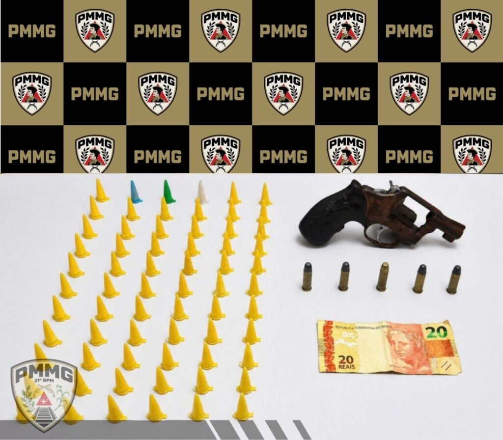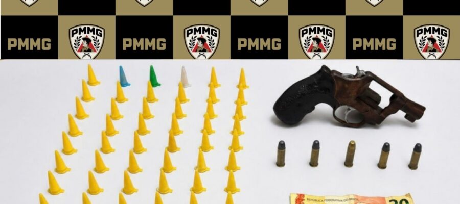 Em diligências, foram localizados 66 pinos contendo substância análoga à cocaína, um revólver calibre .38 com numeração suprimida e munições, além de certa quantia em dinheiro. Um dos autores assumiu a posse da arma de fogo.
